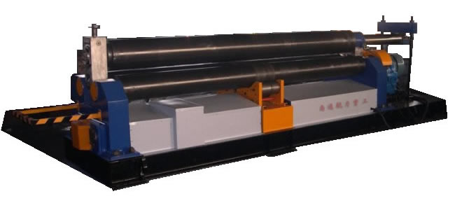 主要特點 該機械式三輥對稱卷板機結構形式為三輥對稱式,上輥在兩下輥中央對稱位置通過錐齒輪傳動作垂直升降運動,通過主減速機的末級齒輪帶動兩下輥齒輪嚙合作旋轉運動,為卷制板材提供扭矩。規格平整的塑性金屬板通過卷板機的三根工作輥(二根下輥、一根上輥)之間,借助上輥的下壓及下輥的旋轉運動,使金屬板經過多道次連續彎曲,產生永久性的塑性變形,卷制成所需要的園筒、錐筒或它們的一部分。該機械式三輥卷板機缺點是板材端部需借助其它設備進行預彎 技術參數