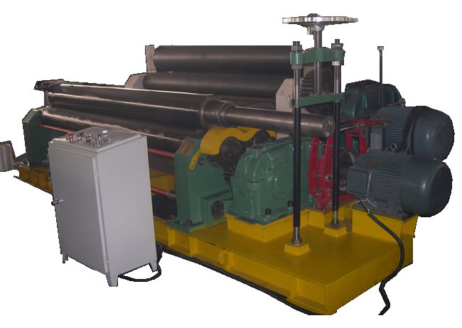 該機械式三輥對稱卷板機結構形式為三輥對稱式,上輥在兩下輥中央對稱位置通過錐齒輪傳動作垂直升降運動,通過主減速機的末級齒輪帶動兩下輥齒輪嚙合作旋轉運動,為卷制板材提供扭矩。規(guī)格平整的塑性金屬板通過卷板機的三根工作輥(二根下輥、一根上輥)之間,借助上輥的下壓及下輥的旋轉運動,使金屬板經(jīng)過多道次連續(xù)彎曲,產(chǎn)生永久性的塑性變形,卷制成所需要的園筒、錐筒或它們的一部分。該機械式三輥卷板機缺點是板材端部需借助其它設備進行預彎